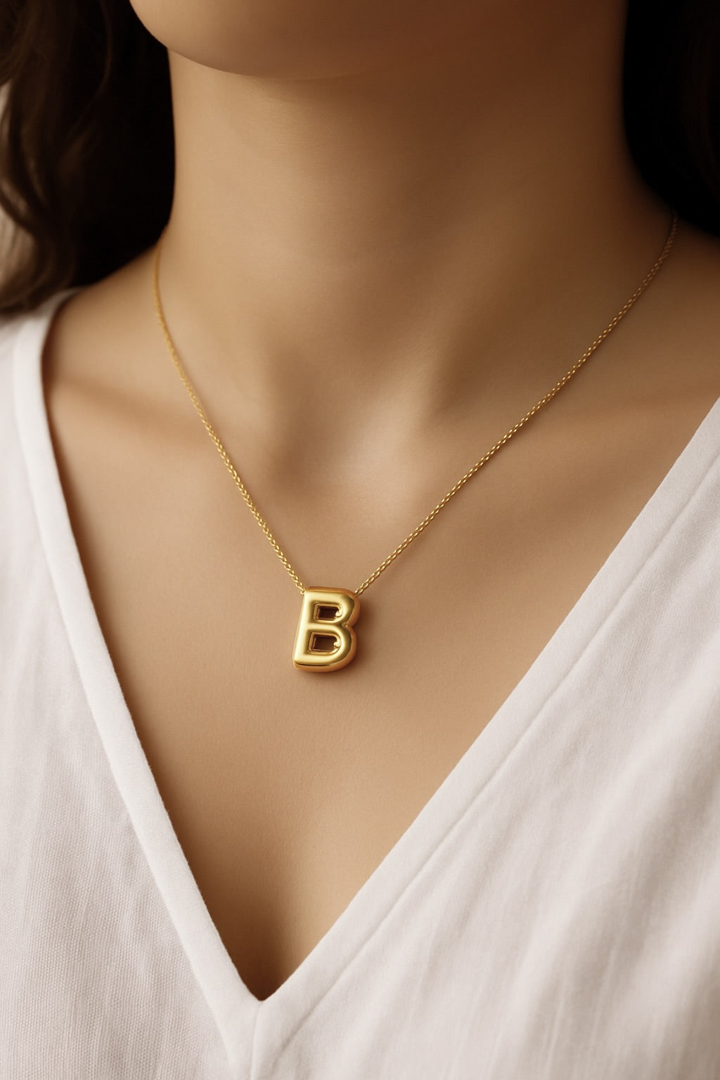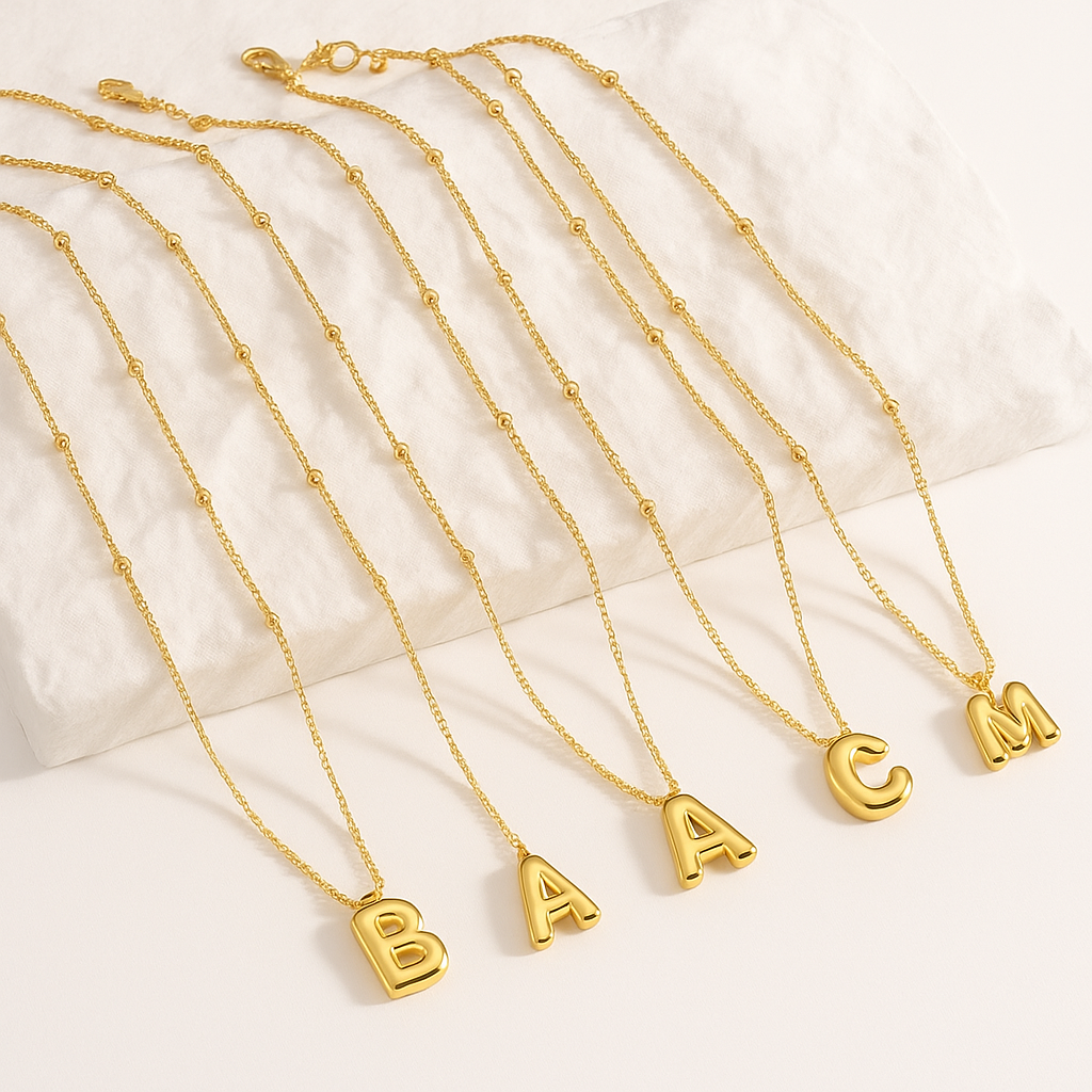 Diseño minimalista y exclusivo con cadena fina con detalles y que pasa discretamente por detrás de la letra y sin enganches visibles.