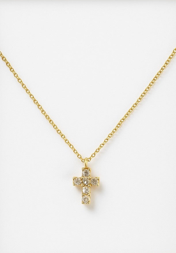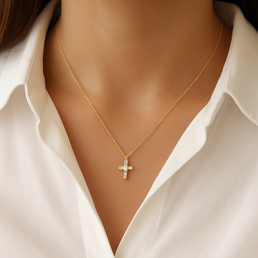 Descubre la delicadeza de nuestra cruz dorada de acero inoxidable 316L, diseñada para brillar con un dorado fino, suave y elegante. Una pieza ligera, resistente al agua, que no se oxida ni pierde color, perfecta para llevar cada día y combinar con cualquier look.